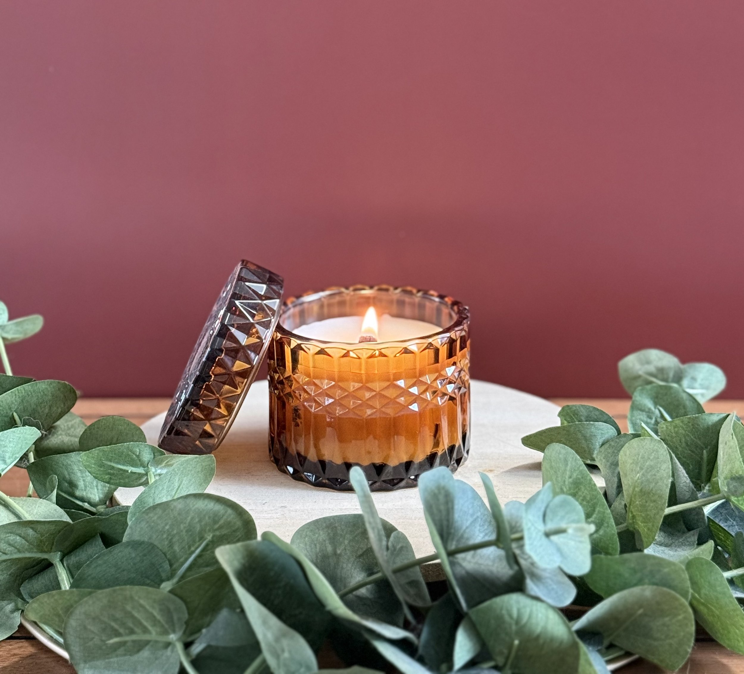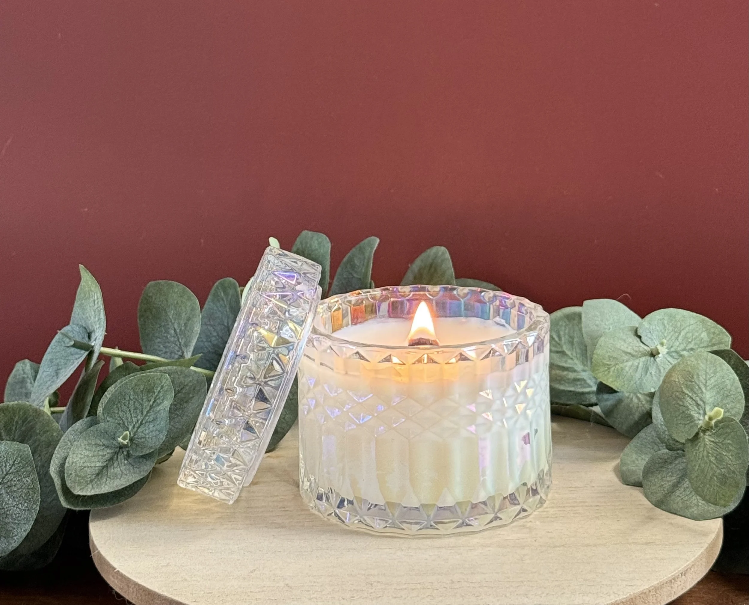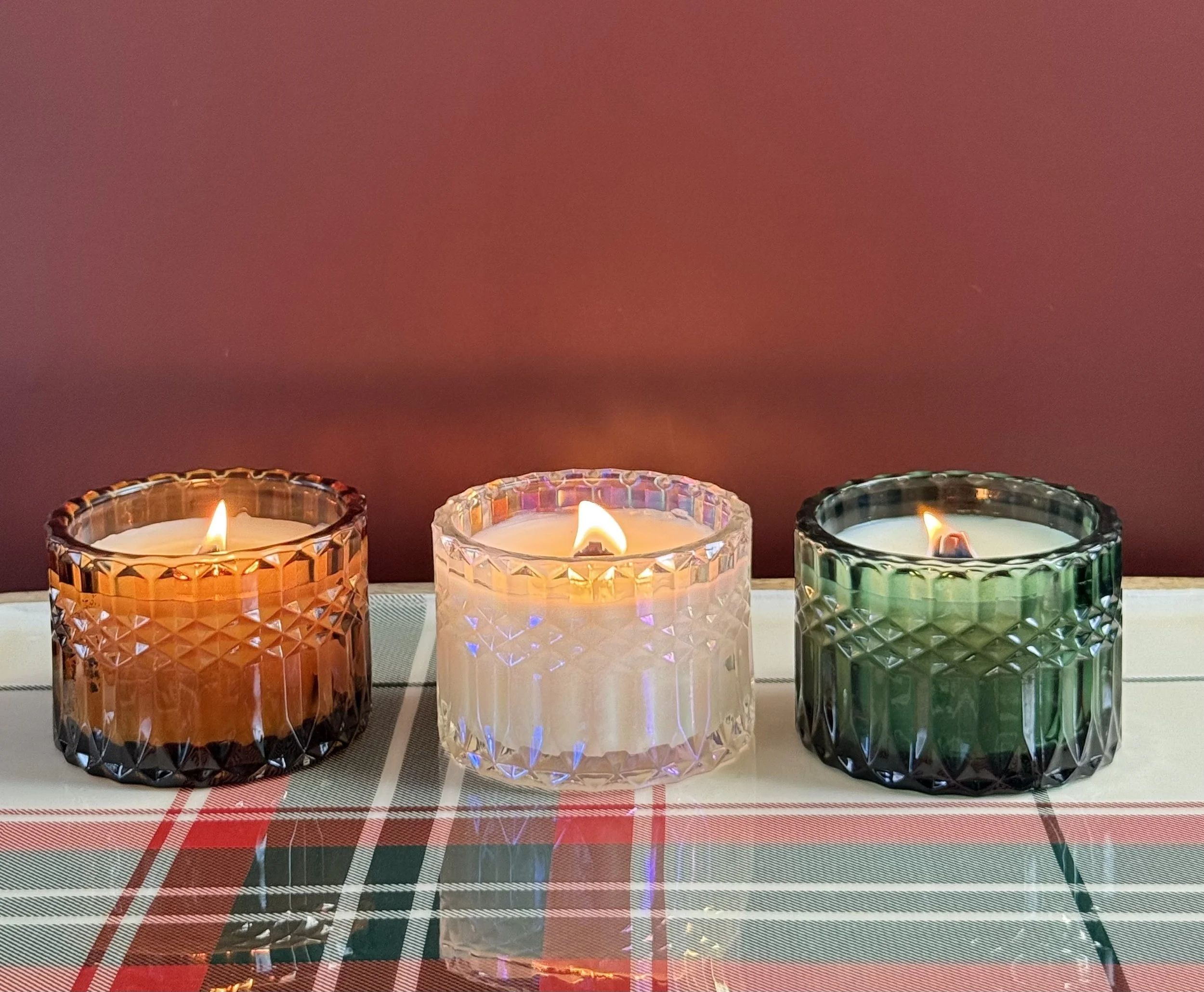 7 oz Elegant candle Jar comes in our premium coconut apricot blend wax and has a wooden wick. The jar comes in three colors, emerald green, amber, iridescent with a matching lid. This candle comes in a box as pictured.