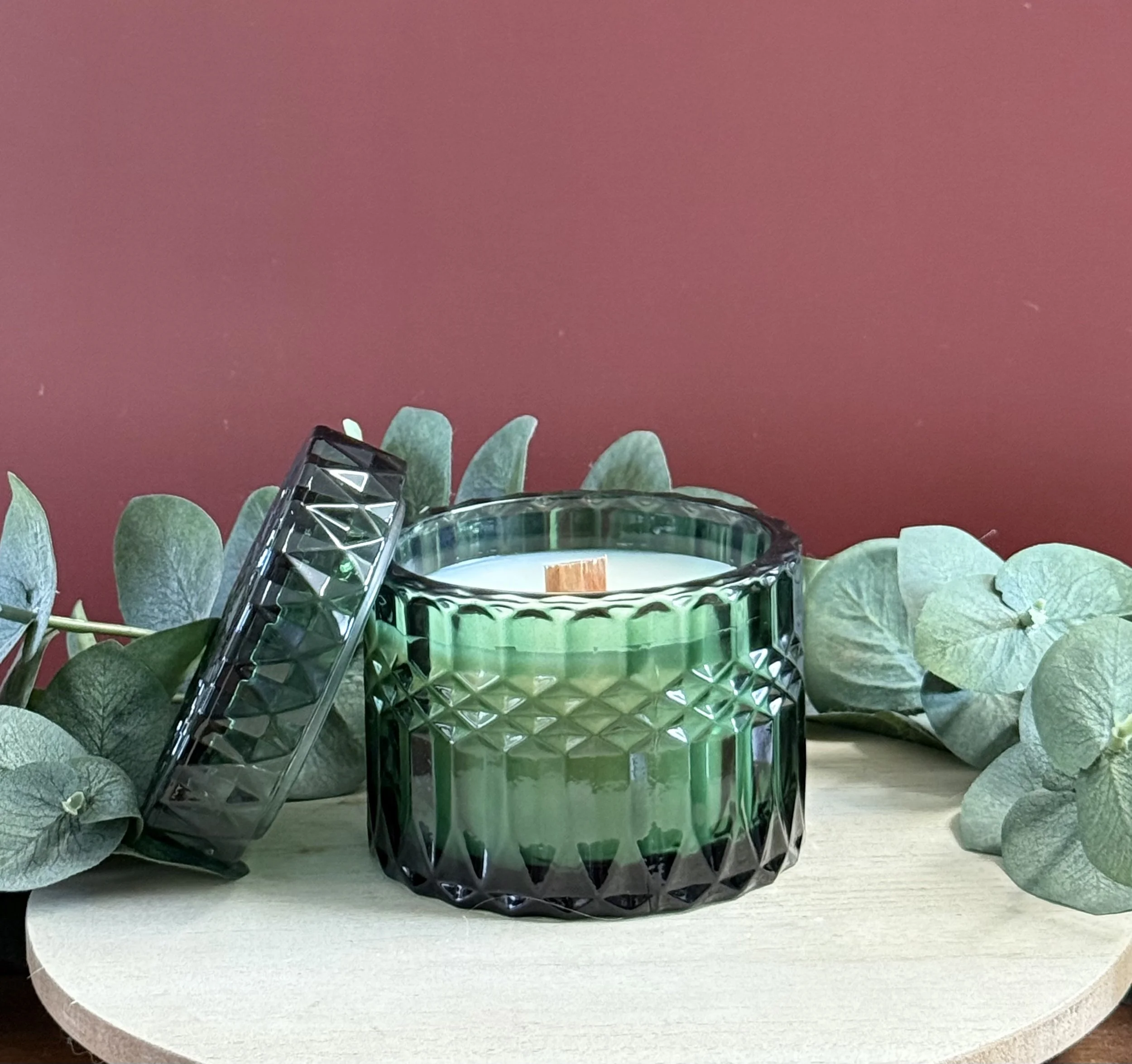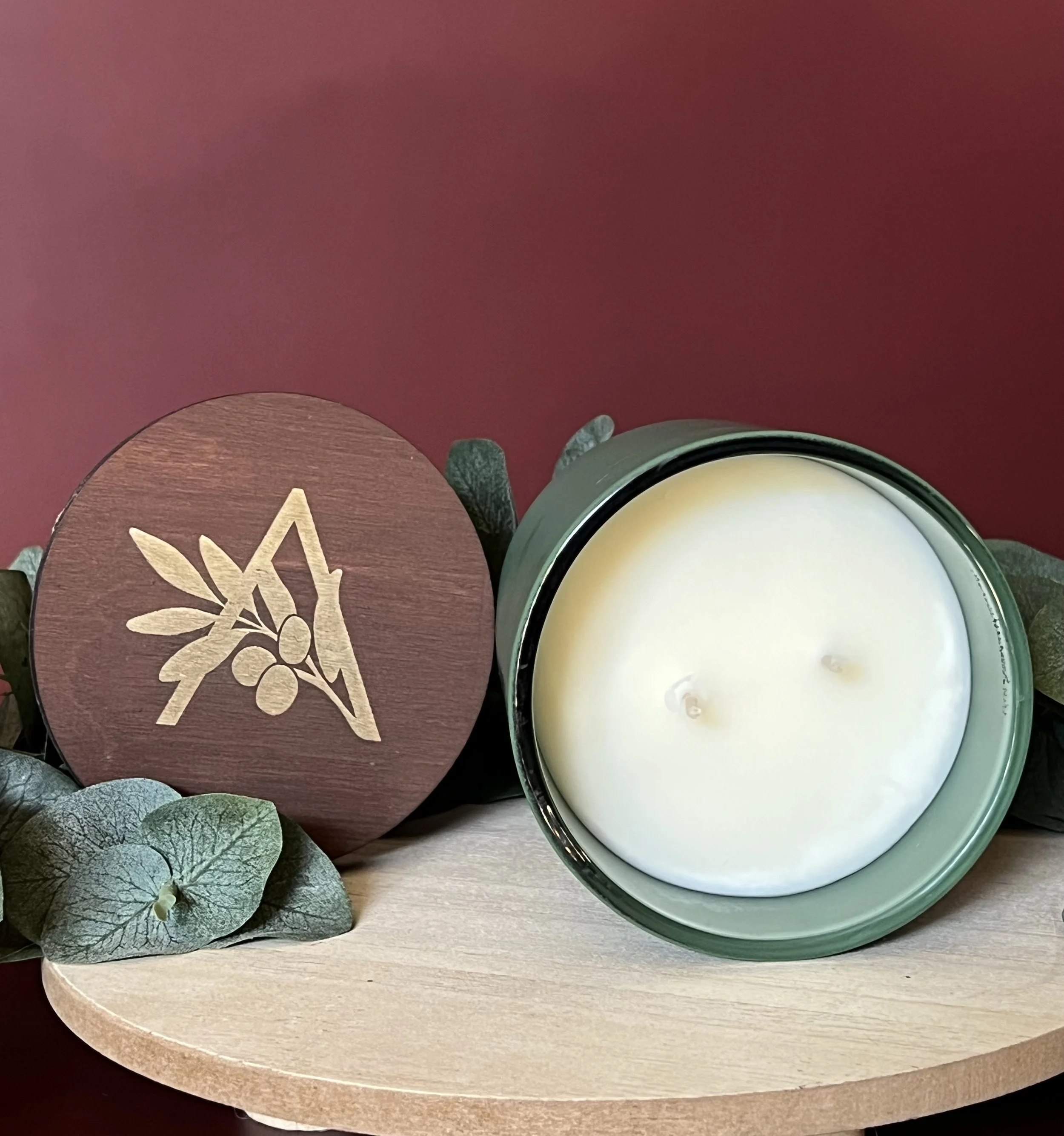 12 oz. Candle jar candles come in matte green with double cotton wicks and an lid.